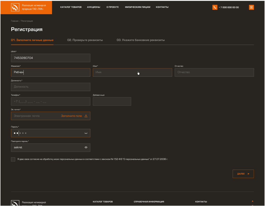 Регистрация контрагента на портале: заполнение контактных данных и реквизитов, формирование учетной записи.